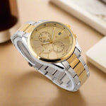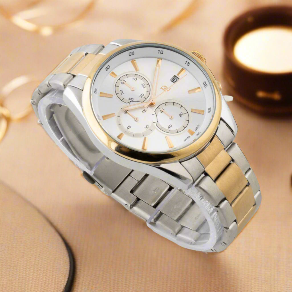 A men's watch with a quartz movement typically features a precise and reliable mechanism. The golden case paired with a white dial offers a classic and elegant aesthetic, suitable for various occasions.