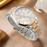 A men's watch with a quartz movement typically features a precise and reliable mechanism. The golden case paired with a white dial offers a classic and elegant aesthetic, suitable for various occasions.