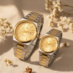 A men's watch with a quartz movement typically features a precise and reliable mechanism. The golden case paired with a white dial offers a classic and elegant aesthetic, suitable for various occasions.