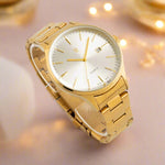 A men's watch with a quartz movement typically features a precise and reliable mechanism. The golden case paired with a white dial offers a classic and elegant aesthetic, suitable for various occasions.