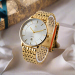 A men's watch with a quartz movement typically features a precise and reliable mechanism. The golden case paired with a white dial offers a classic and elegant aesthetic, suitable for various occasions.