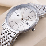 A men's watch with a quartz movement typically features a precise and reliable mechanism. The golden case paired with a white dial offers a classic and elegant aesthetic, suitable for various occasions.