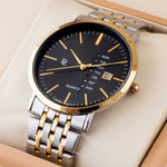 A men's watch with a quartz movement typically features a precise and reliable mechanism. The golden case paired with a white dial offers a classic and elegant aesthetic, suitable for various occasions.