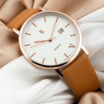 A men's watch with a quartz movement typically features a precise and reliable mechanism. The golden case paired with a white dial offers a classic and elegant aesthetic, suitable for various occasions.