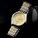 A men's watch with a quartz movement typically features a precise and reliable mechanism. The golden case paired with a white dial offers a classic and elegant aesthetic, suitable for various occasions.