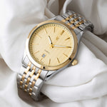 A men's watch with a quartz movement typically features a precise and reliable mechanism. The golden case paired with a white dial offers a classic and elegant aesthetic, suitable for various occasions.