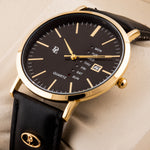 A men's watch with a quartz movement typically features a precise and reliable mechanism. The golden case paired with a white dial offers a classic and elegant aesthetic, suitable for various occasions.