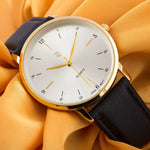 A men's watch with a quartz movement typically features a precise and reliable mechanism. The golden case paired with a white dial offers a classic and elegant aesthetic, suitable for various occasions.