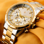 A men's watch with a quartz movement typically features a precise and reliable mechanism. The golden case paired with a white dial offers a classic and elegant aesthetic, suitable for various occasions.