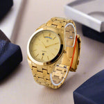 A men's watch with a quartz movement typically features a precise and reliable mechanism. The golden case paired with a white dial offers a classic and elegant aesthetic, suitable for various occasions.