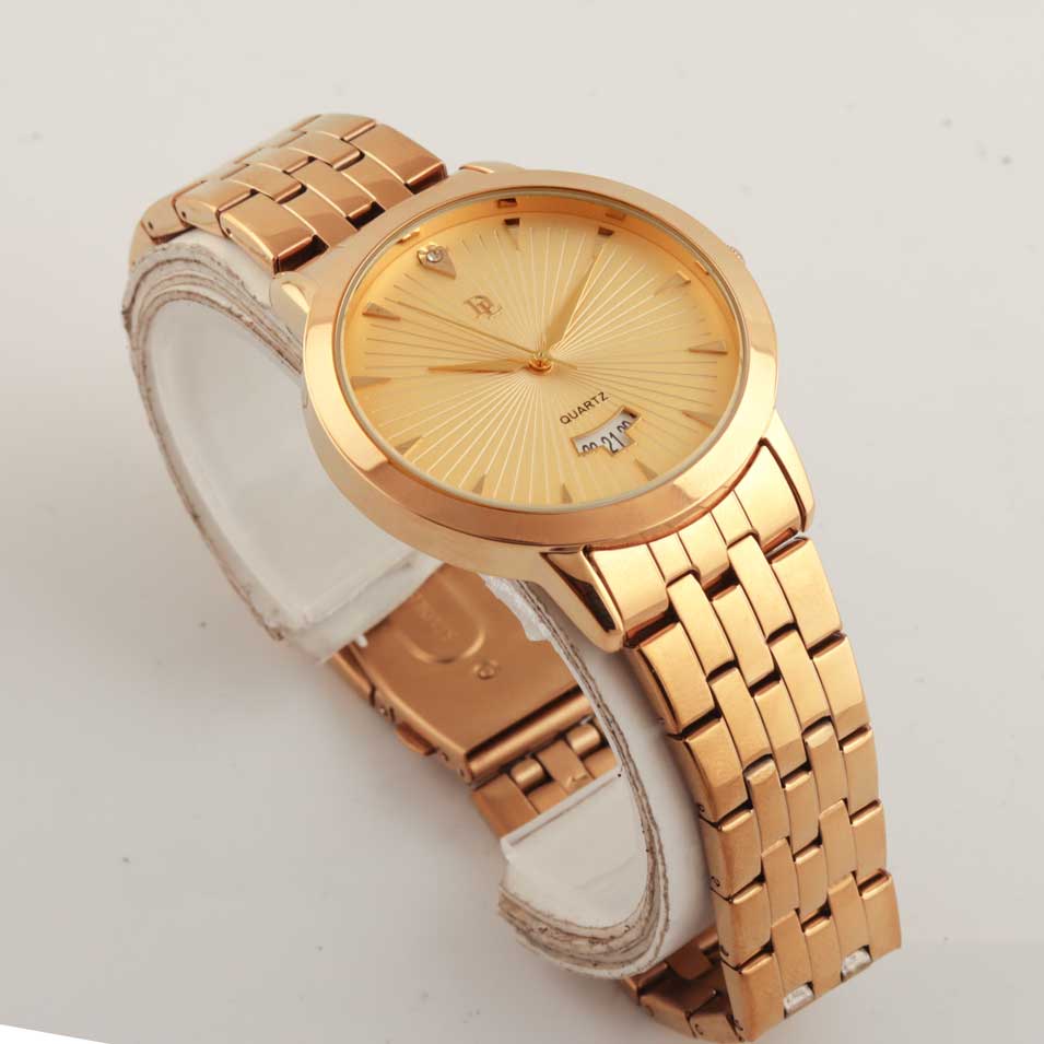 A men's watch with a quartz movement typically features a precise and reliable mechanism. The golden case paired with a white dial offers a classic and elegant aesthetic, suitable for various occasions.