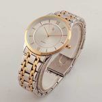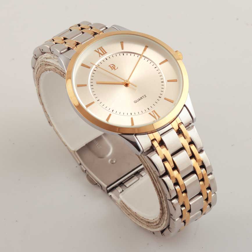 A men's watch with a quartz movement typically features a precise and reliable mechanism. The golden case paired with a white dial offers a classic and elegant aesthetic, suitable for various occasions.