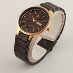 A men's watch with a quartz movement typically features a precise and reliable mechanism. The golden case paired with a white dial offers a classic and elegant aesthetic, suitable for various occasions.