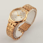 A men's watch with a quartz movement typically features a precise and reliable mechanism. The golden case paired with a white dial offers a classic and elegant aesthetic, suitable for various occasions.