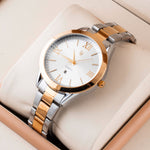 A men's watch with a quartz movement typically features a precise and reliable mechanism. The golden case paired with a white dial offers a classic and elegant aesthetic, suitable for various occasions.