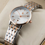 A men's watch with a quartz movement typically features a precise and reliable mechanism. The golden case paired with a white dial offers a classic and elegant aesthetic, suitable for various occasions.