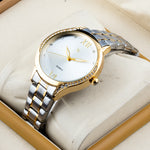 A men's watch with a quartz movement typically features a precise and reliable mechanism. The golden case paired with a white dial offers a classic and elegant aesthetic, suitable for various occasions.