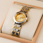 A men's watch with a quartz movement typically features a precise and reliable mechanism. The golden case paired with a white dial offers a classic and elegant aesthetic, suitable for various occasions.