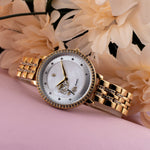 A men's watch with a quartz movement typically features a precise and reliable mechanism. The golden case paired with a white dial offers a classic and elegant aesthetic, suitable for various occasions.