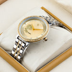 A men's watch with a quartz movement typically features a precise and reliable mechanism. The golden case paired with a white dial offers a classic and elegant aesthetic, suitable for various occasions.