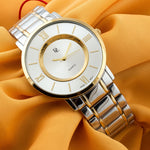 A men's watch with a quartz movement typically features a precise and reliable mechanism. The golden case paired with a white dial offers a classic and elegant aesthetic, suitable for various occasions.