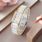 A men's watch with a quartz movement typically features a precise and reliable mechanism. The golden case paired with a white dial offers a classic and elegant aesthetic, suitable for various occasions.
