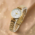 A men's watch with a quartz movement typically features a precise and reliable mechanism. The golden case paired with a white dial offers a classic and elegant aesthetic, suitable for various occasions.