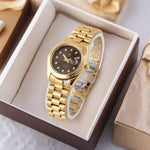A men's watch with a quartz movement typically features a precise and reliable mechanism. The golden case paired with a white dial offers a classic and elegant aesthetic, suitable for various occasions.