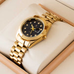 A men's watch with a quartz movement typically features a precise and reliable mechanism. The golden case paired with a white dial offers a classic and elegant aesthetic, suitable for various occasions.