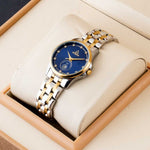 A men's watch with a quartz movement typically features a precise and reliable mechanism. The golden case paired with a white dial offers a classic and elegant aesthetic, suitable for various occasions.