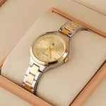 A men's watch with a quartz movement typically features a precise and reliable mechanism. The golden case paired with a white dial offers a classic and elegant aesthetic, suitable for various occasions.