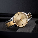 A men's watch with a quartz movement typically features a precise and reliable mechanism. The golden case paired with a white dial offers a classic and elegant aesthetic, suitable for various occasions.