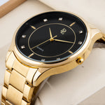 A men's watch with a quartz movement typically features a precise and reliable mechanism. The golden case paired with a white dial offers a classic and elegant aesthetic, suitable for various occasions.