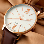 A men's watch with a quartz movement typically features a precise and reliable mechanism. The golden case paired with a white dial offers a classic and elegant aesthetic, suitable for various occasions.
