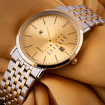 A men's watch with a quartz movement typically features a precise and reliable mechanism. The golden case paired with a white dial offers a classic and elegant aesthetic, suitable for various occasions.