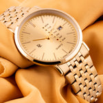 A men's watch with a quartz movement typically features a precise and reliable mechanism. The golden case paired with a white dial offers a classic and elegant aesthetic, suitable for various occasions.