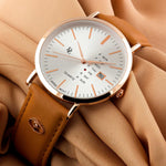 A men's watch with a quartz movement typically features a precise and reliable mechanism. The golden case paired with a white dial offers a classic and elegant aesthetic, suitable for various occasions.