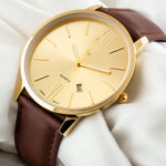 A men's watch with a quartz movement typically features a precise and reliable mechanism. The golden case paired with a white dial offers a classic and elegant aesthetic, suitable for various occasions.