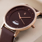 The brown dial watch with a leather strap is a stylish timepiece that combines classic design with modern features. It features a rich brown dial and a durable leather strap. It comes with a 12-month warranty, ensuring peace of mind and protection