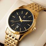 A men's watch with a quartz movement typically features a precise and reliable mechanism. The golden case paired with a white dial offers a classic and elegant aesthetic, suitable for various occasions.