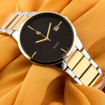 A men's watch with a quartz movement typically features a precise and reliable mechanism. The golden case paired with a white dial offers a classic and elegant aesthetic, suitable for various occasions.