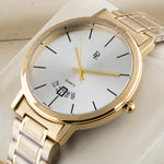 A men's watch with a quartz movement typically features a precise and reliable mechanism. The golden case paired with a white dial offers a classic and elegant aesthetic, suitable for various occasions.