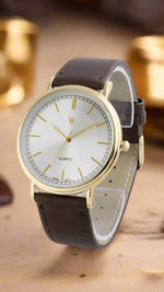 A men's watch with a quartz movement typically features a precise and reliable mechanism. The golden case paired with a white dial offers a classic and elegant aesthetic, suitable for various occasions.