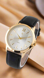 A men's watch with a quartz movement typically features a precise and reliable mechanism. The golden case paired with a white dial offers a classic and elegant aesthetic, suitable for various occasions.