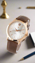 A men's watch with a quartz movement typically features a precise and reliable mechanism. The golden case paired with a white dial offers a classic and elegant aesthetic, suitable for various occasions.