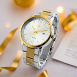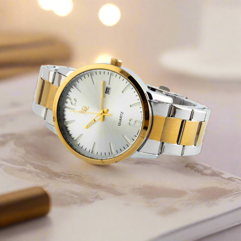 A men's watch with a quartz movement typically features a precise and reliable mechanism. The golden case paired with a white dial offers a classic and elegant aesthetic, suitable for various occasions.