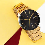 A men's watch with a quartz movement typically features a precise and reliable mechanism. The golden case paired with a white dial offers a classic and elegant aesthetic, suitable for various occasions.