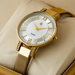 A men's watch with a quartz movement typically features a precise and reliable mechanism. The golden case paired with a white dial offers a classic and elegant aesthetic, suitable for various occasions.