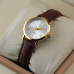 A men's watch with a quartz movement typically features a precise and reliable mechanism. The golden case paired with a white dial offers a classic and elegant aesthetic, suitable for various occasions.