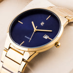 A men's watch with a quartz movement typically features a precise and reliable mechanism. The golden case paired with a white dial offers a classic and elegant aesthetic, suitable for various occasions.